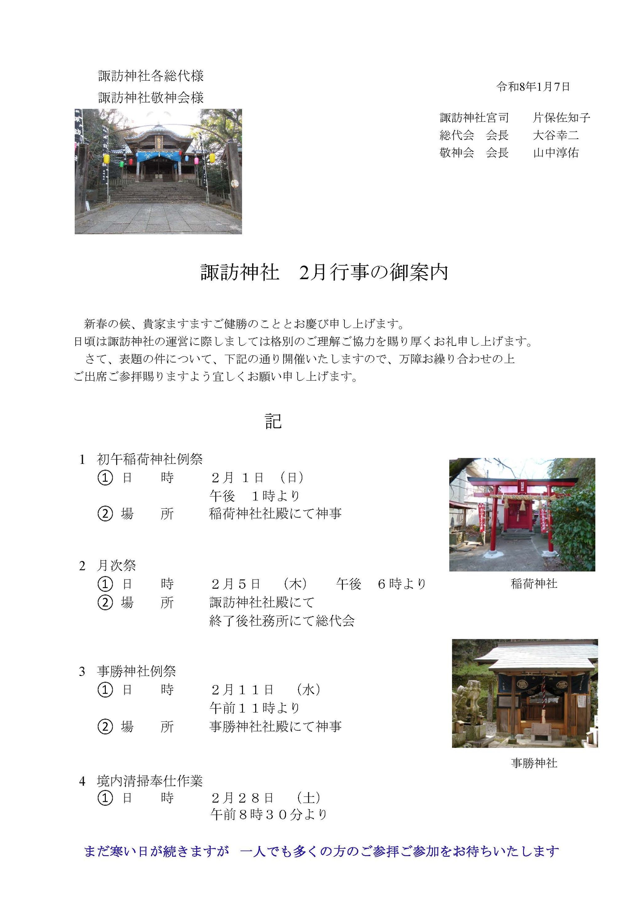 令和8年行事2025/12/2 11:272026/1/2 23:40令和7年行事2025/3/0 7:552025/12/2 11:26令和6年行事2025/3/0 7:542025/3/0 7:55令和5年行事2025/3/0 7:512025/3/0 7:53諏訪神社のいろいろ