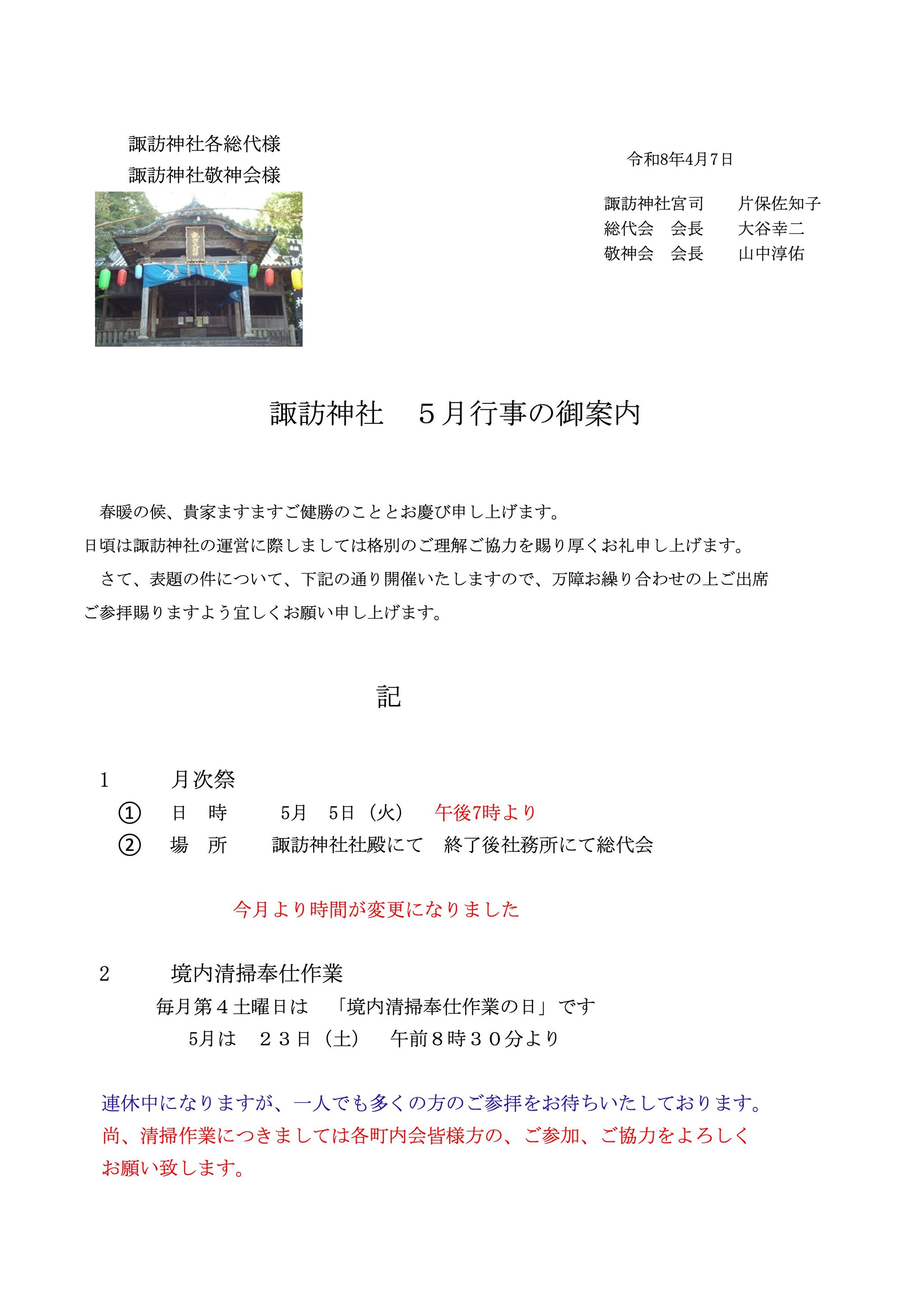 令和8年行事2025/12/2 11:272026/4/4 9:44令和7年行事2025/3/0 7:552025/12/2 11:26令和6年行事2025/3/0 7:542025/3/0 7:55令和5年行事2025/3/0 7:512025/3/0 7:53諏訪神社境内にある神社の案内